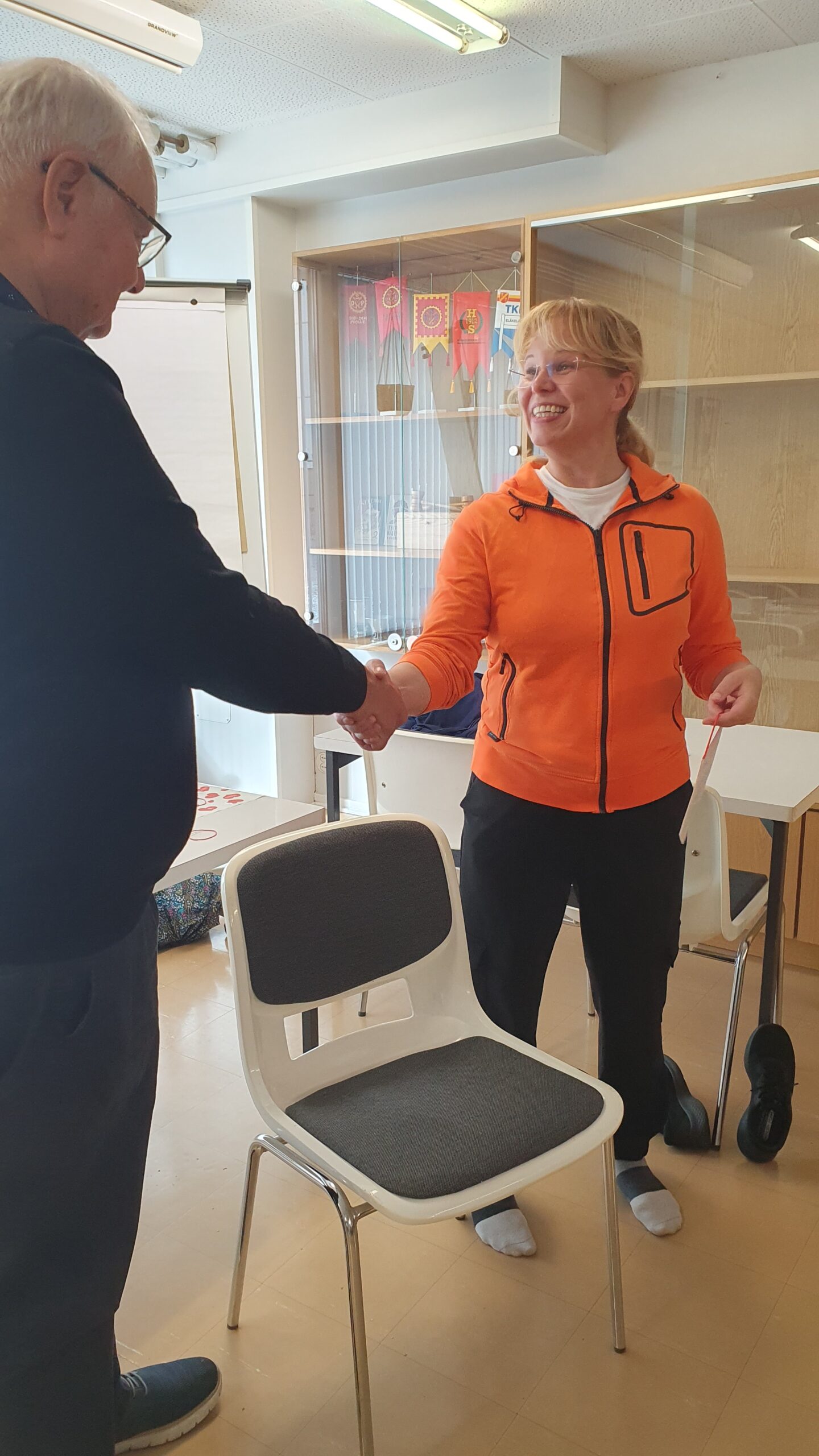 Puheenjohtaja Jorma Penttilä kiitti Fysioterapeutti Irinaa kiinnostavasta esityksestä ja antoi hänelle muistoksi vierailusta yhdistyksen viirin.